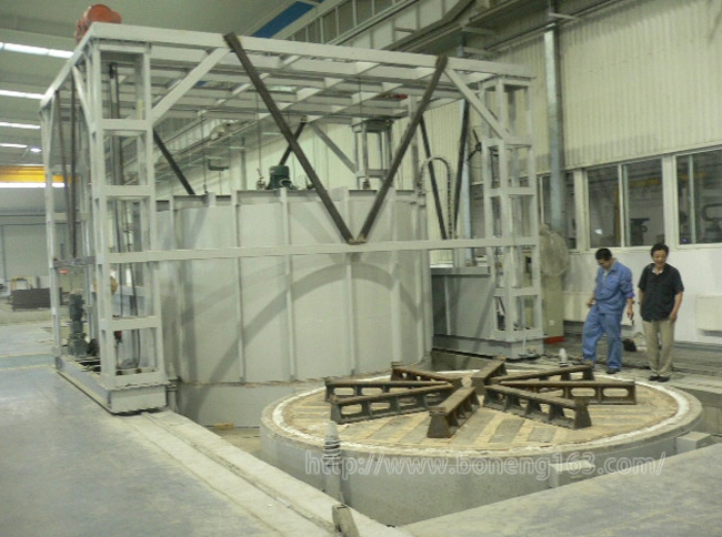 加热元件选用高温电阻合金丝绕制成螺旋状,散布 在 炉侧、炉门、后墙及安放台车搁丝砖上,并用国标插口砖固定, 安全简练。台车上安装有耐压抗高温的铸钢炉底板,以承载工 件之用。为了防止工件加热后 产生的氧化皮经过炉底板间的缝 隙落入加热元件周围而造成加热元件损坏,罩式淬火炉因此炉底板 与炉体触摸处选用刺进式触摸。为正常运用,需求经常吹扫台车炉底板下方的氧化皮一般每周吹扫一次,吹扫时将炉底板 吊起,用压缩空气将电阻丝槽内的氧化皮屑吹扫干净,留意防 止氧化皮卡在炉丝内引起短。炉门设备 由炉门、炉门提升组织 和炉门压紧设备组成。炉门壳体由型钢与板材焊接而成牢固框 架构造,内用耐火纤维模块叠铺而成,要求保温性能好,重量轻等。