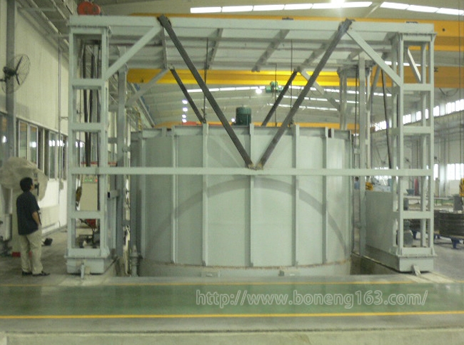 罩式炉由一台加热罩、两台炉座、两台内罩、一台冷却罩组成,加热罩采用钢板卷制密焊成型,炉衬采用节能型新技术全纤维模块结构,炉顶为全纤维波浪叠法高压捆扎吊平顶,高铝螺钉挂装电阻带,炉顶安装双孔快冷降温门。 炉座为保温水冷真空橡胶密封结构,不锈钢导风座台,大功率真空密封风机。 内罩为不锈钢板卷制密焊成型,罩底法兰和真空密封槽由大型立车精车加工成型。 冷却罩由双风机螺旋送风快速冷却。真空泵为2x系列旋片式机械真空泵。 罩式炉控温柜采用微电脑程序工艺曲线高精度自动控温,自动完成热处理工艺曲线。由微电脑通过运算直接控制晶闸管,对炉内功率进行调节,减少了电网波动,能根据装炉量及工艺斜率自动改变功率大小,实现高度节电控温。
